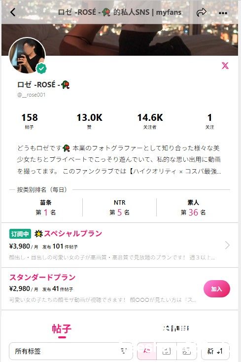 myfans博主ロゼ-ROSÉ@__rose001,自行订阅价值3980日元,折合RMB200元,内含原档4K视频101部,截止2025年5.21日。